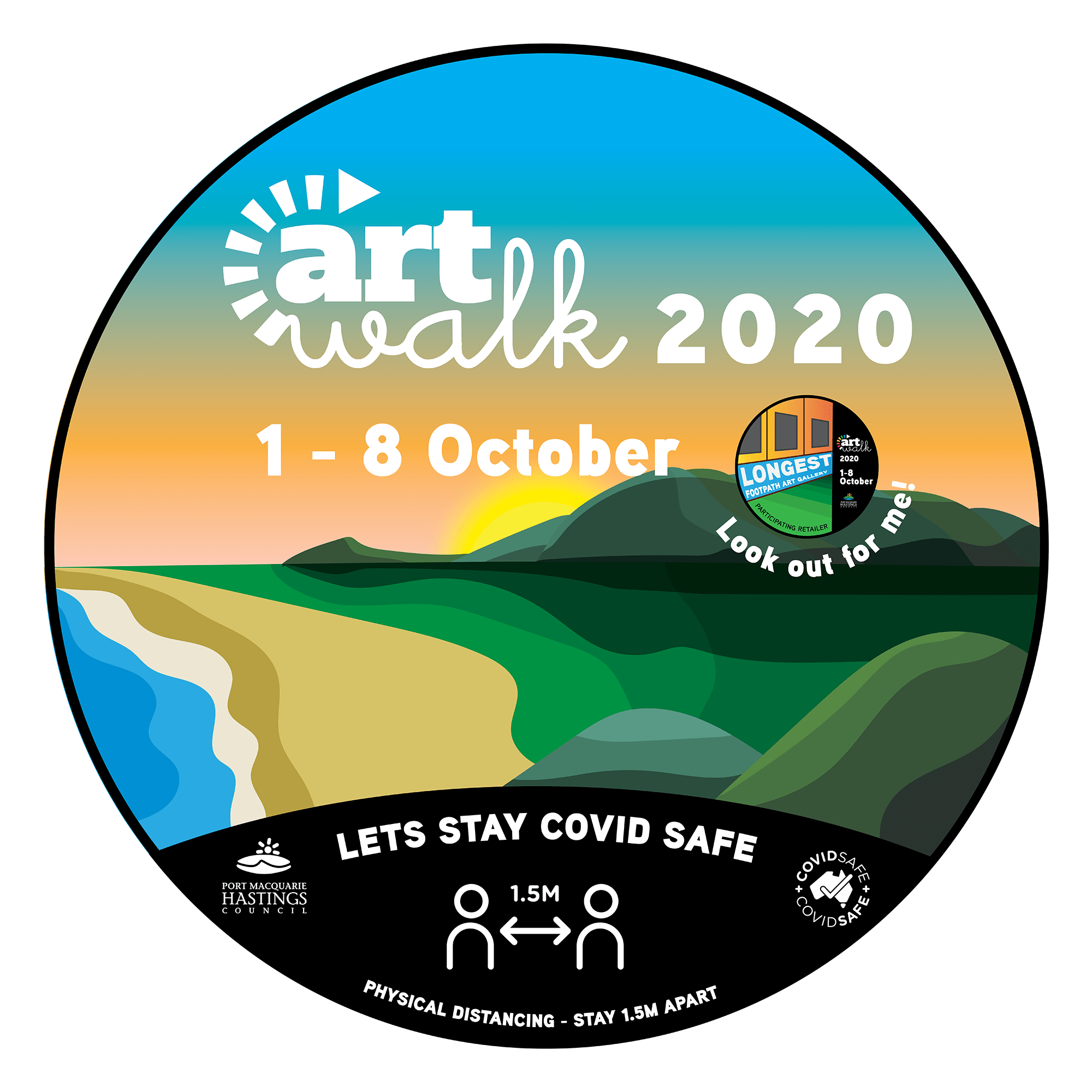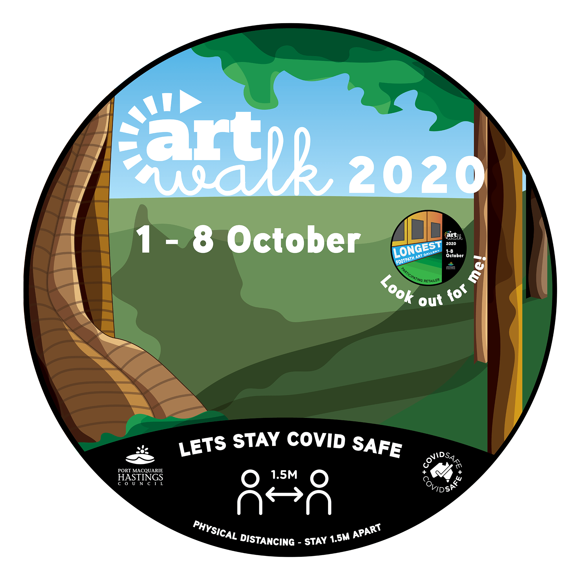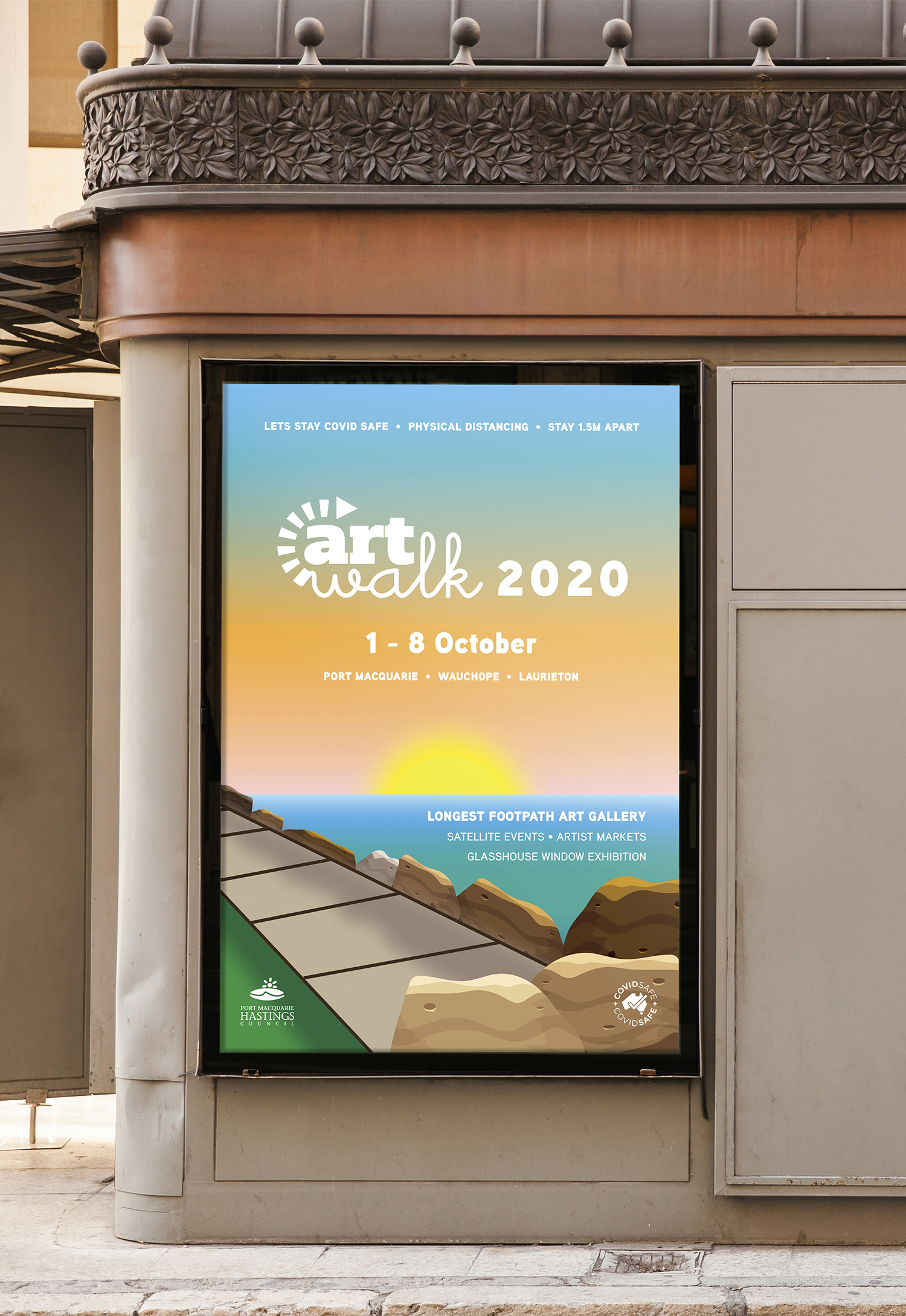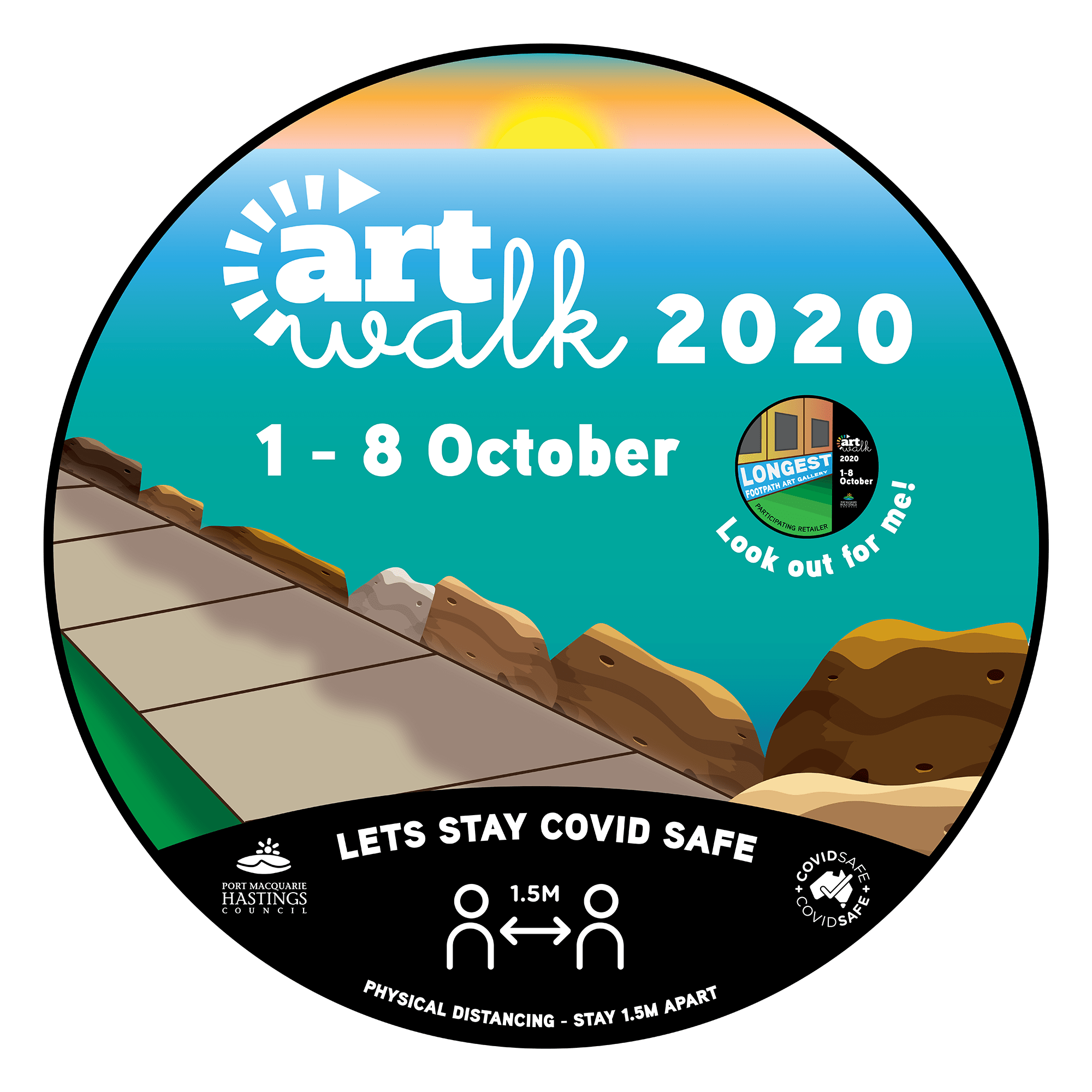 For this project I designed a series of footpath stickers and posters for ArtWalk. ArtWalk is a community project organised by the Port Macquarie Hastings Point Council. It provides a space and opportunity for local creatives to showcase their work and also attract visitors to the region boosting the local economy. In previous years it has operated as an event which encouraged large crowds, interaction with artists, artworks and each other. However with COVID-19 ArtWalk is adapting this year and is running under the banner, ‘The Longest Footpath Art Gallery.‘