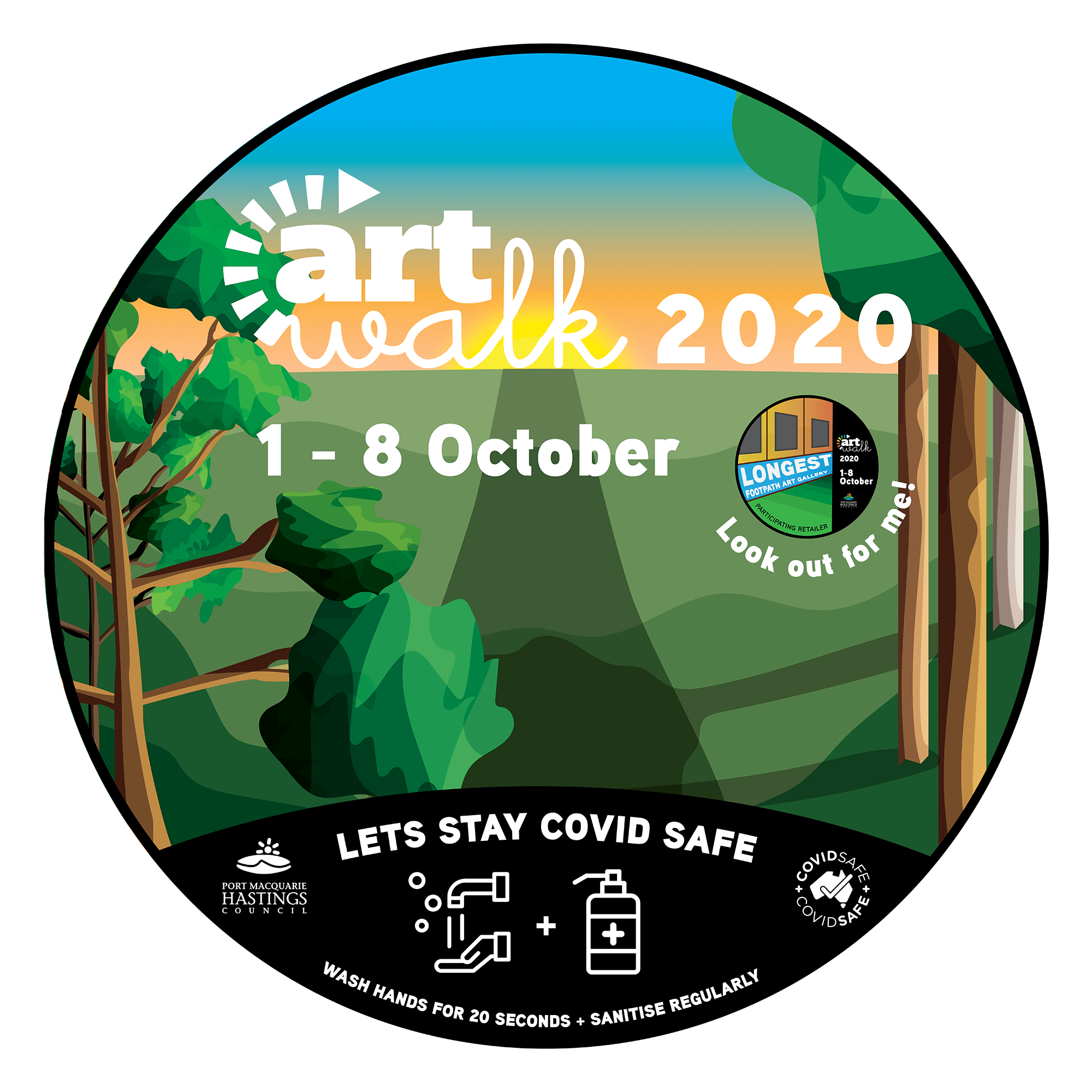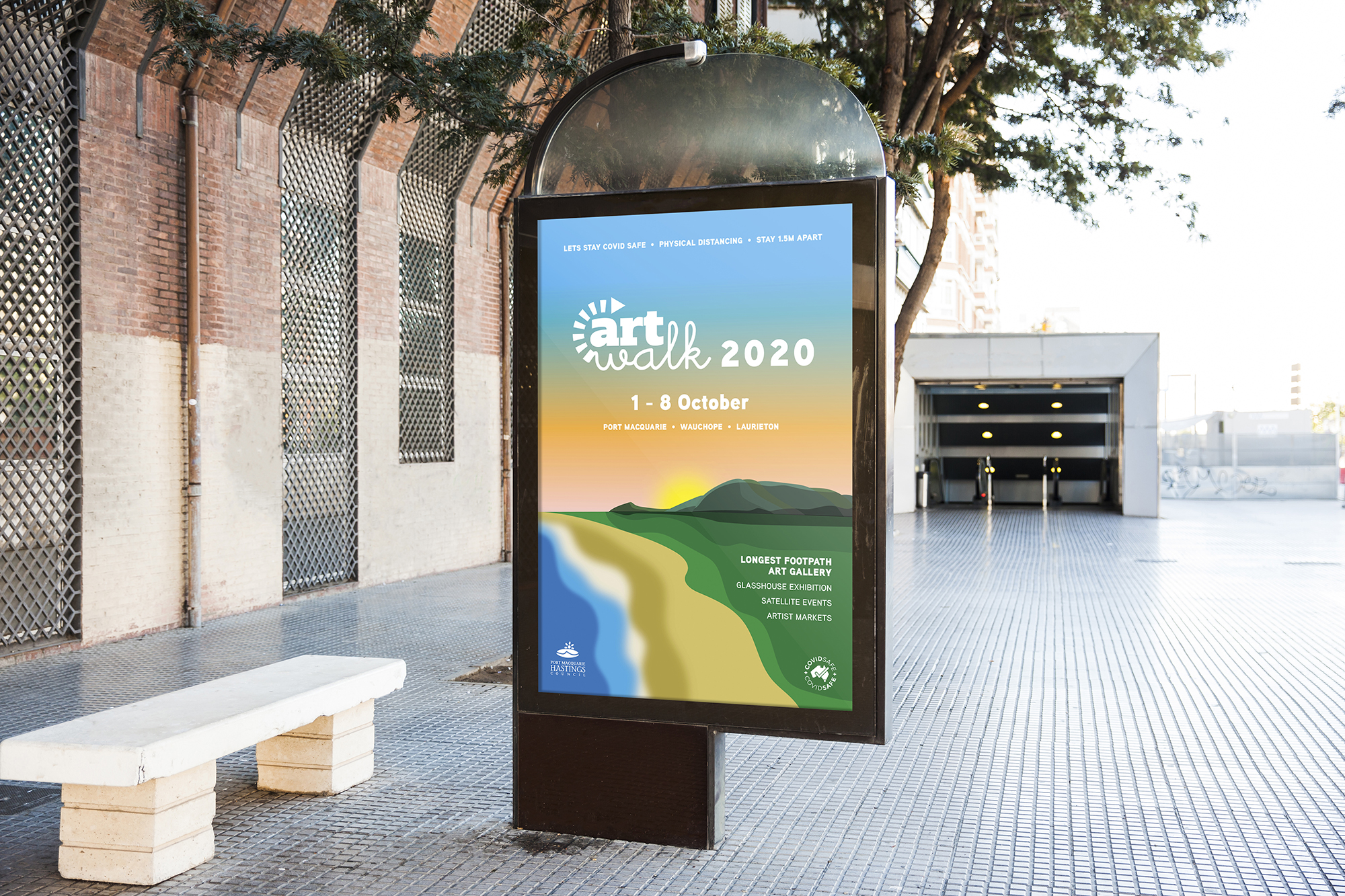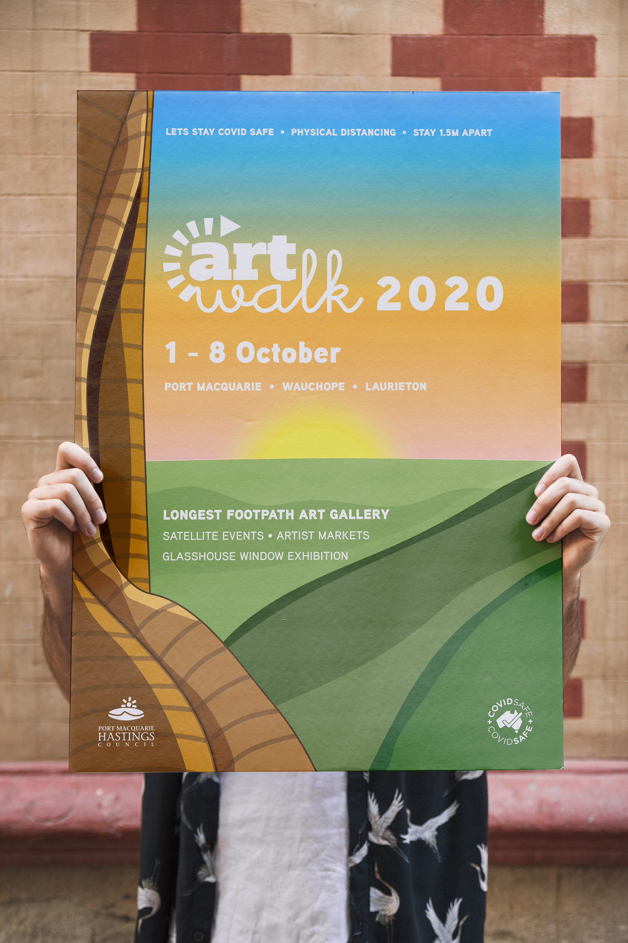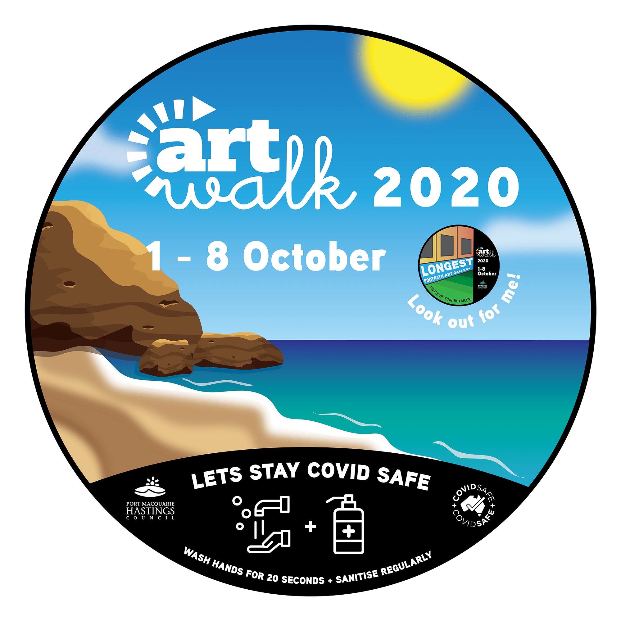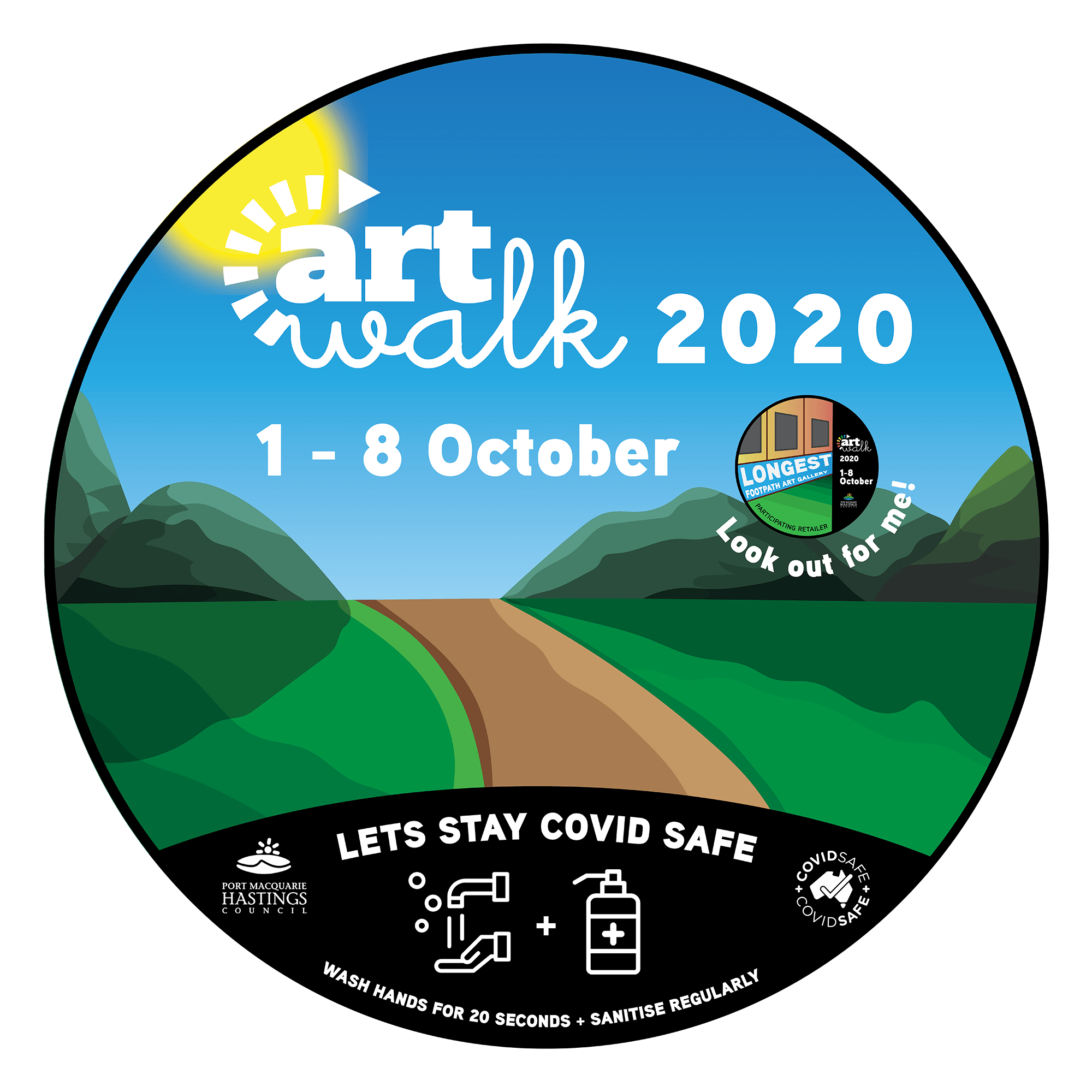 For this project I designed a series of footpath stickers and posters for ArtWalk. ArtWalk is a community project organised by the Port Macquarie Hastings Point Council. It provides a space and opportunity for local creatives to showcase their work and also attract visitors to the region boosting the local economy. In previous years it has operated as an event which encouraged large crowds, interaction with artists, artworks and each other. However with COVID-19 ArtWalk is adapting this year and is running under the banner, ‘The Longest Footpath Art Gallery.‘